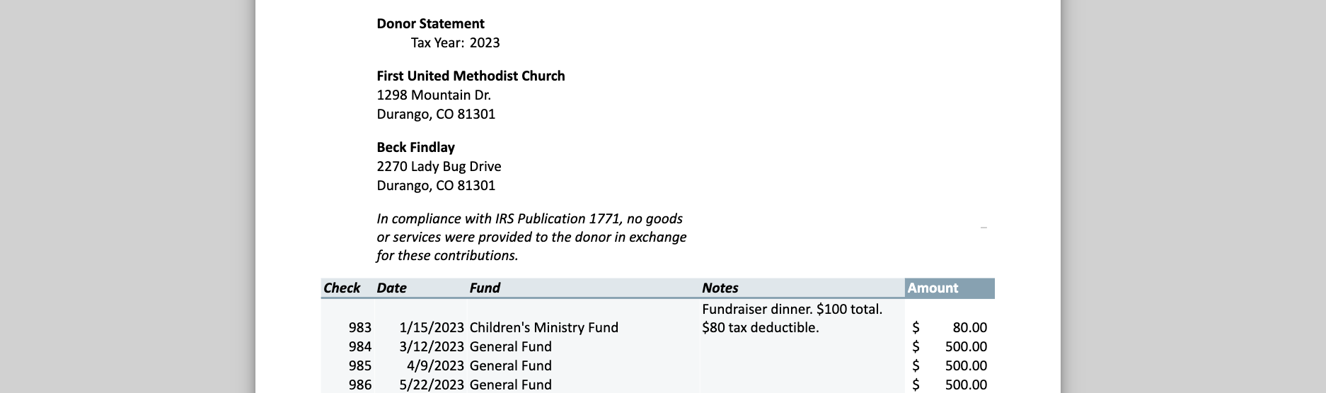 Track revenue, expenses, fund balances, budgets, and generate reports and donor statements.